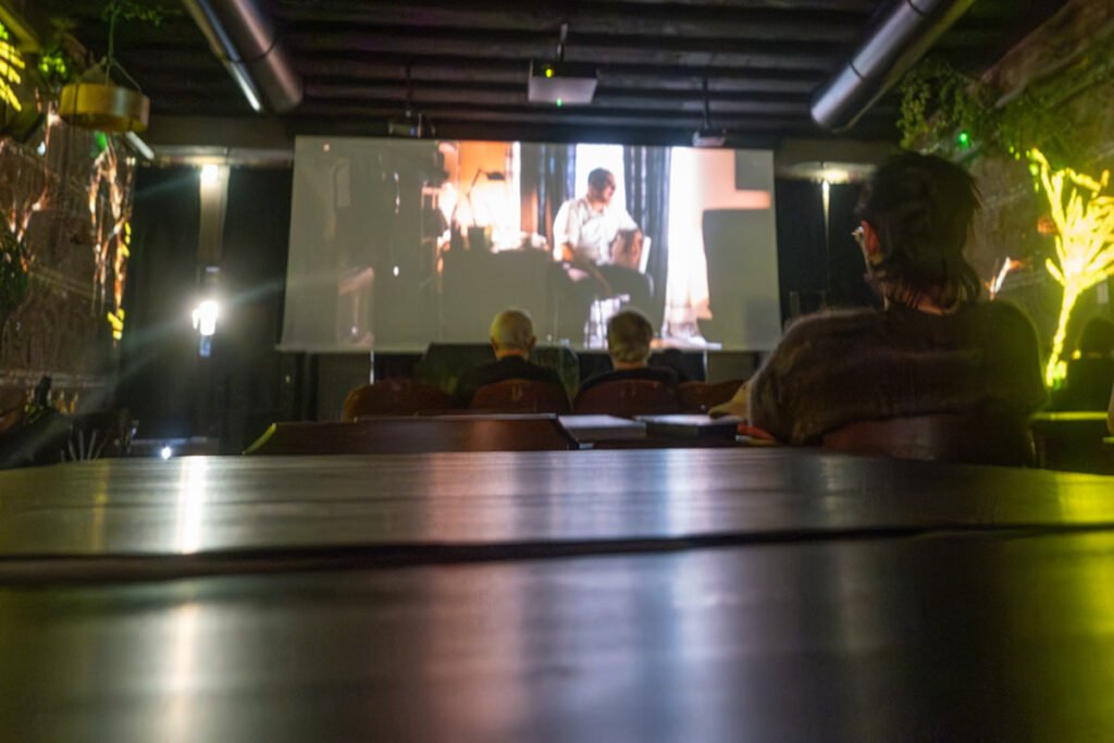 Every seat in the house, whether in the vintage theatre chairs or at one of our tables, offers an unobstructed view of the screen. This is cinema-grade quality in a space designed for conviviality — the first theater where you can watch a film in full cinematic excellence with a cocktail in hand.